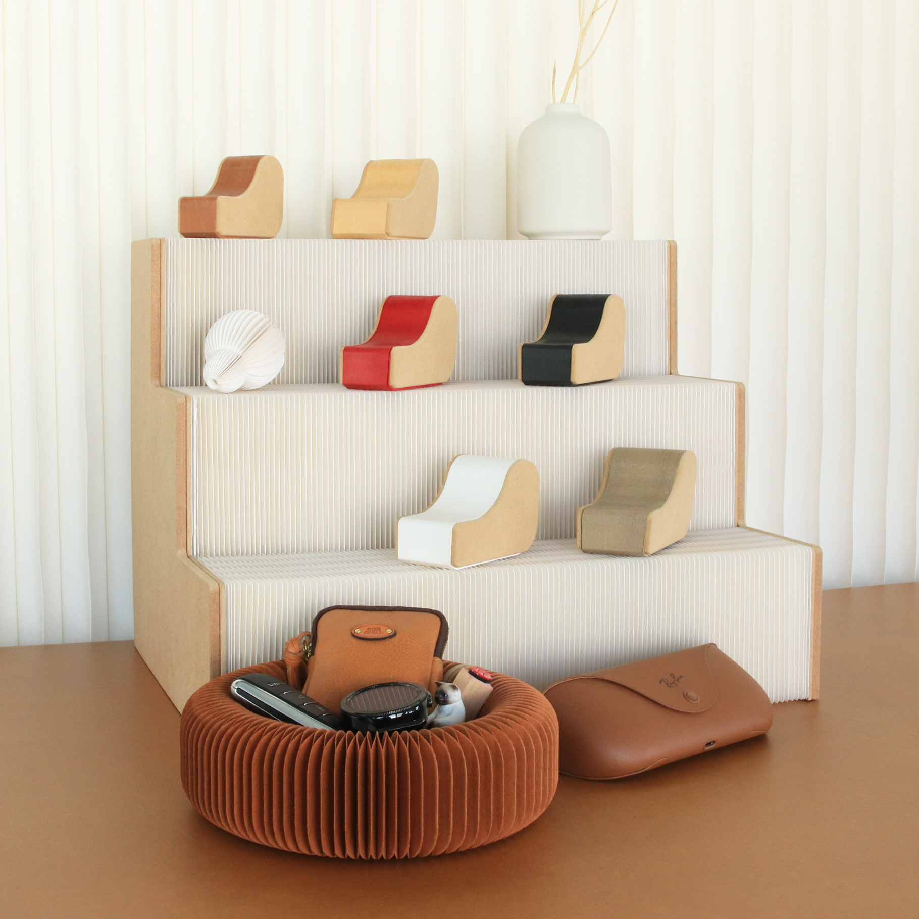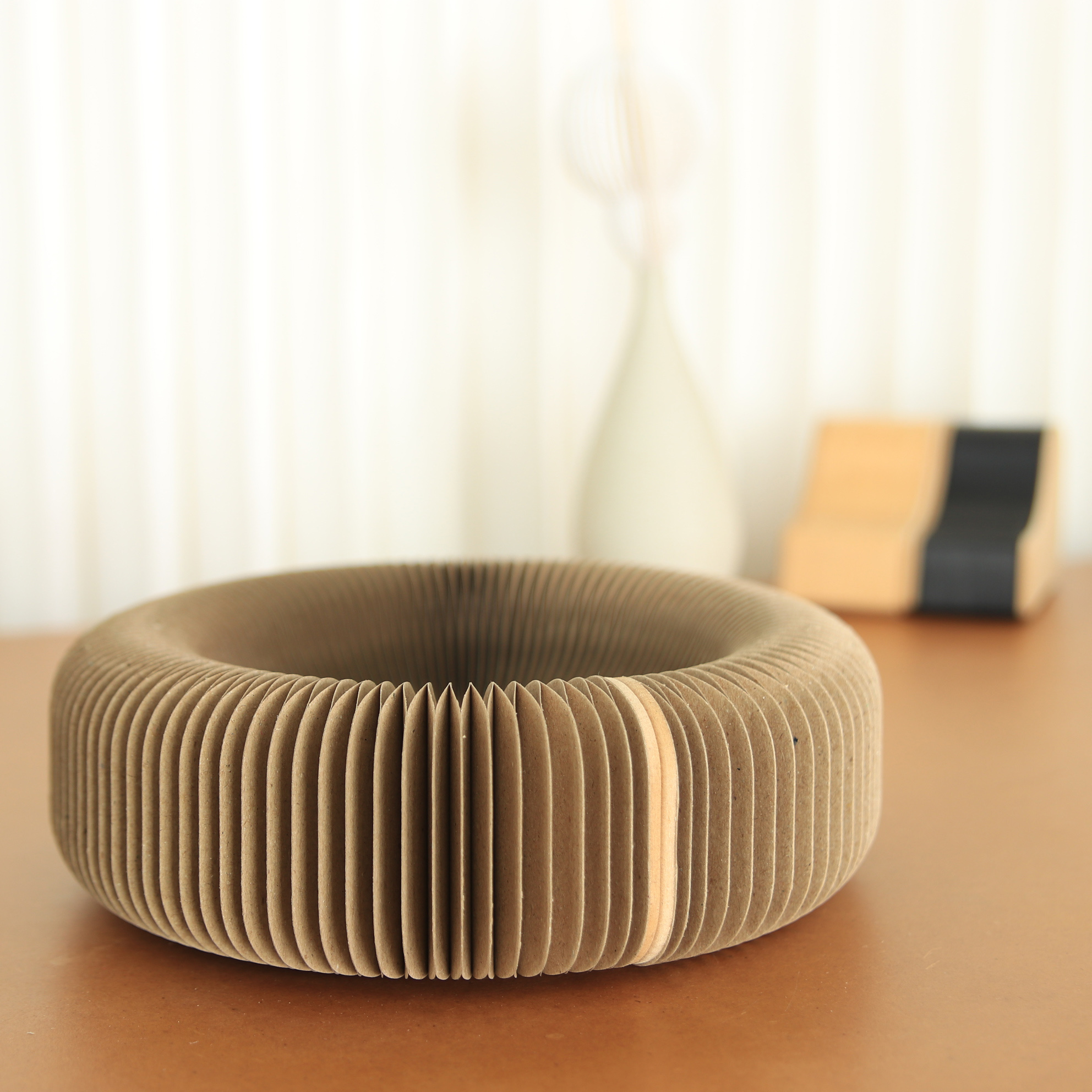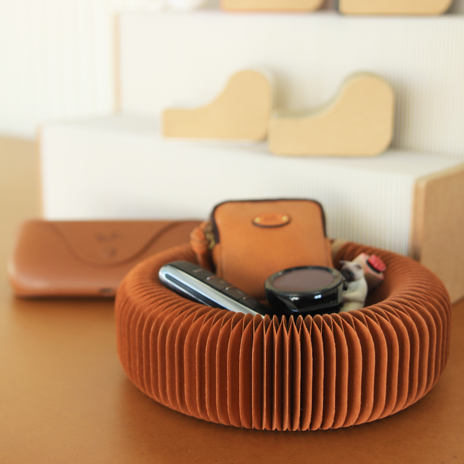 蜂巢紙材天然的質感與回彈特性,讓你放下金屬或玻璃小物時,只有輕柔的觸碰聲。